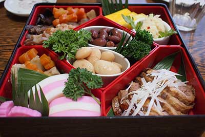 数の子、黒豆、栗きんとん、たたきゴボウ、八幡巻き