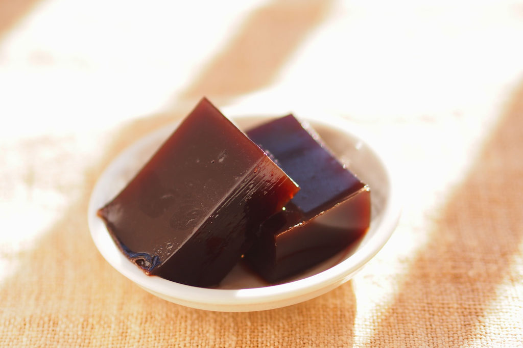 お節の黒豆の煮汁で作った寒天 ちょっと塩味が強いので、白いのと混ぜたらいいかな