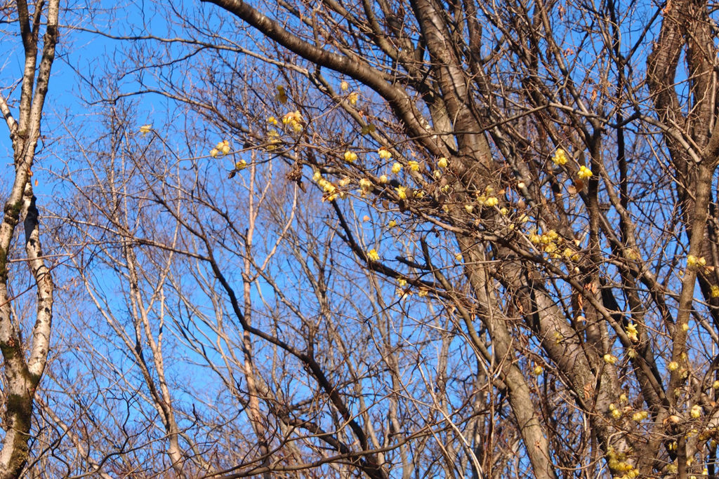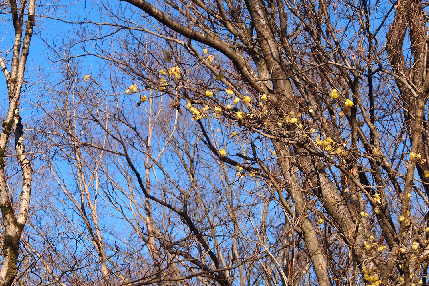 散歩コースに咲いていた、蝋梅と青空がキレイでした