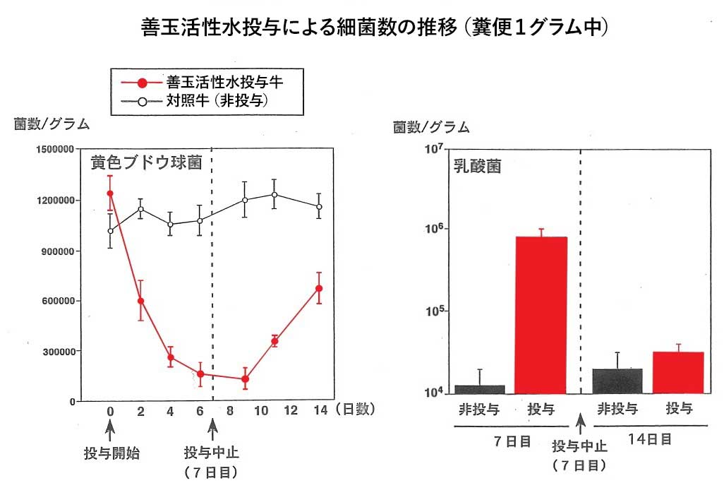 牛の飲料水に「善玉活性水」を1,000倍希釈程度で飲ませてから、排出されるふん便中の細菌数を投与後1週間、中止後1週間で調査しました。