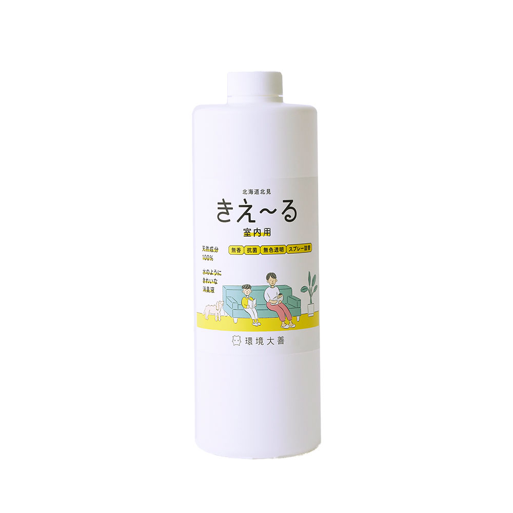 きえーるは、無色透明液(液色透明)と有色液(液色茶色)と2種類あり、無色透明液は、室内用、洗濯用、ペット用、車用など用途別に販売されていますが、全て同一成分となります。有色液の方が効果が強いため、色物のつけ置きなどには有色液をお勧めします。無色透明液は特殊な製法で無色透明にして、北見市の水道水試験をクリアするほど安全な消臭液となっています。