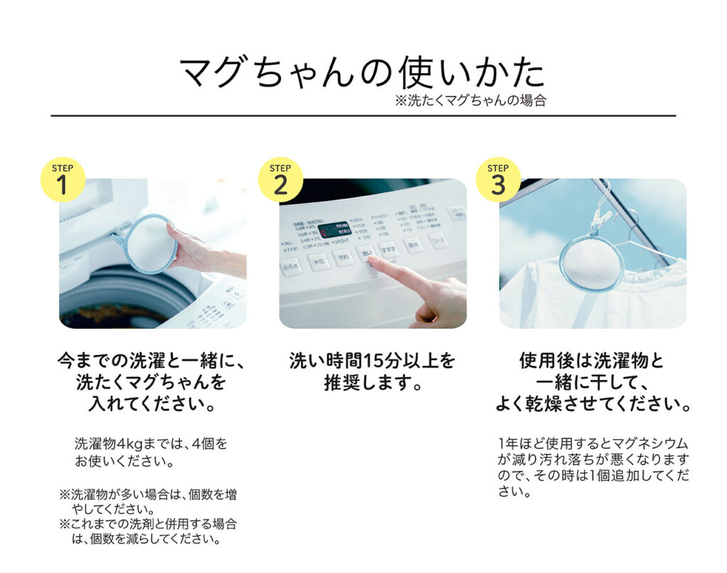 どんな洗剤も使えなくなってしまった化学物質過敏症の方に、救世主ともいえる洗たく補助剤です。液体マグちゃんとの併用で洗い上がりがさらにスッキリです。皮脂汚れ、汚れの強いものには液体マグちゃんも一緒にお使いください。